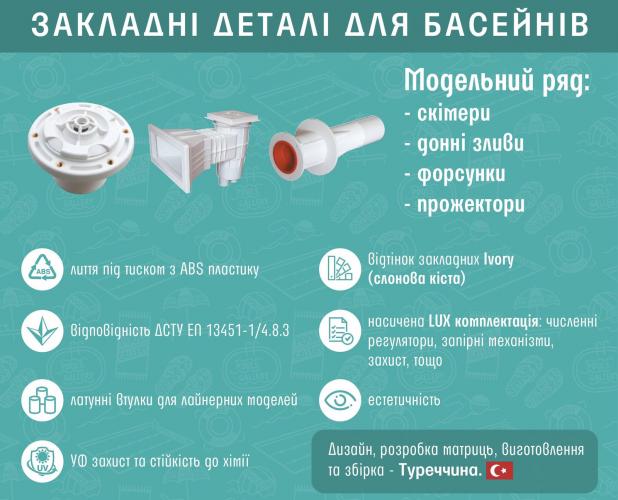 Матеріал виготовлення ABS пластик, стійкий до впливу УФ променів та хімічного складу води.