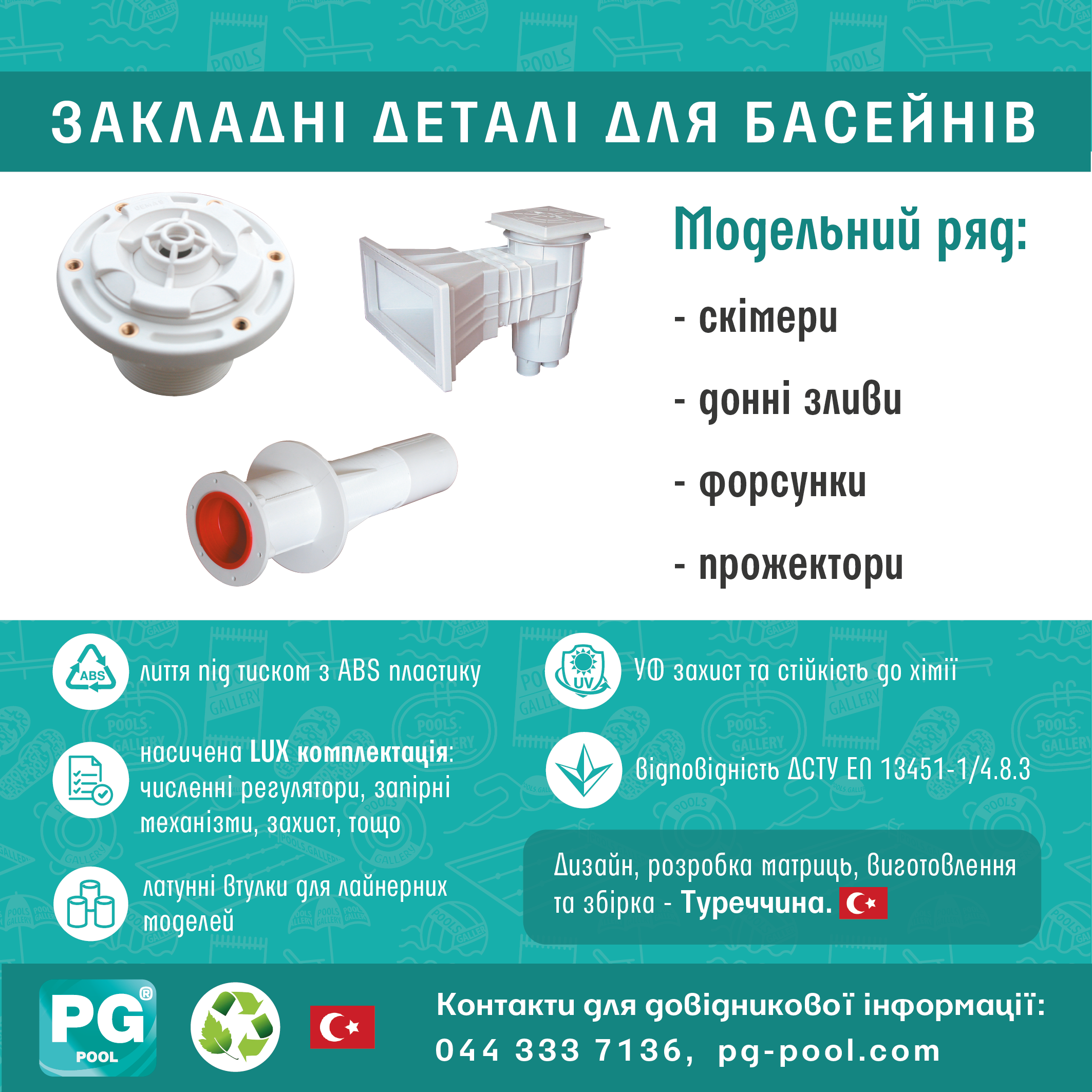 - Матеріал виготовлення: ABS пластик, стійкий до впливу УФ променів, температур та хімічного складу води.