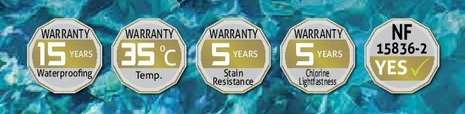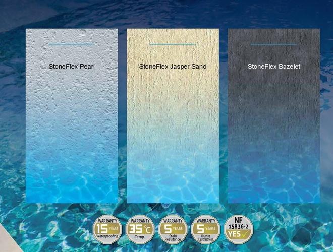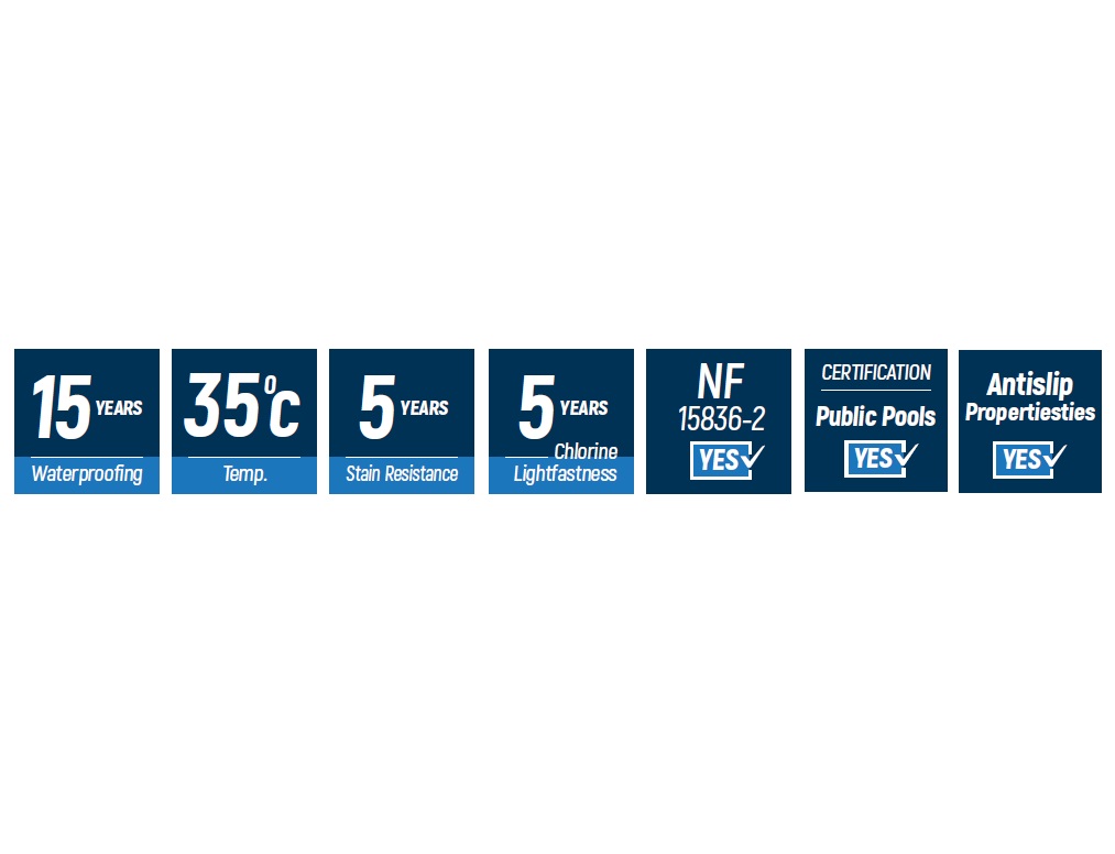 Армований лайнер StoneFlex для внутрішнього облицювання басейну має всі необхідні документи і сертифікати: ISO 9001, ISO 14001 & 50001, OHSAS 18001, DIN, SKZ, BBA, CE, ISI, CSTB, FM, і RAL-GZ 716/1, ЄС 1907 / 2006, NF 5 54-803-2 EN 15836-2-2011, а також відповідає рекомендаціям KSW (німецькі громадські басейни).
