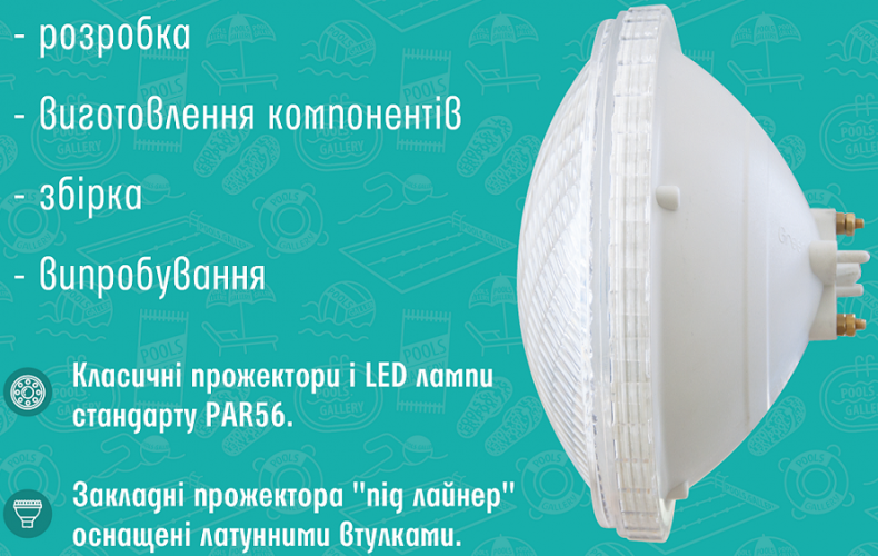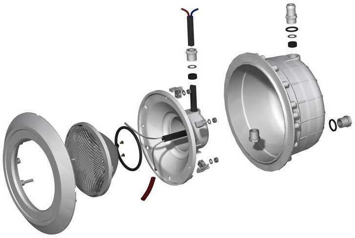 Прожектор для басейну PG арт. PG-051118 - закладна деталь для бетонних басейнів з облицюванням під плитку або мозаїку, комплектується стандартною галогеновою лампою світіння білого кольору PAR56 потужністю 300 Вт.