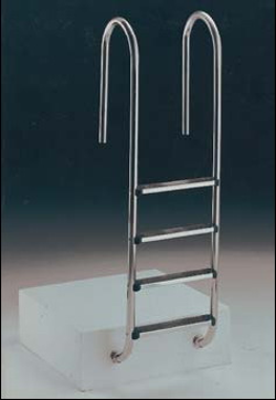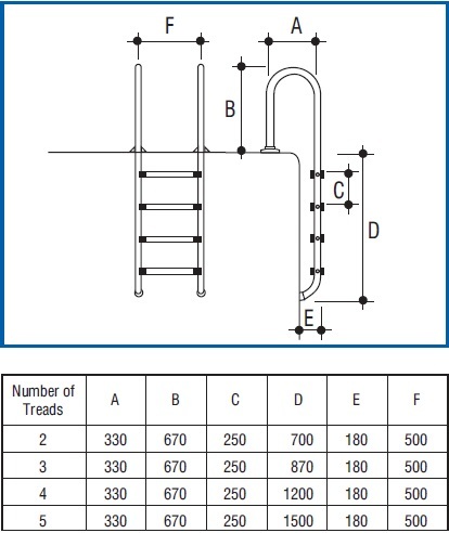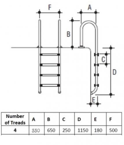 Має поручні з діаметром труби - 42 мм, які кріпляться до борту басейну, нижня частина сходів монтується до стінки басейну за допомогою прогумованої заглушки.