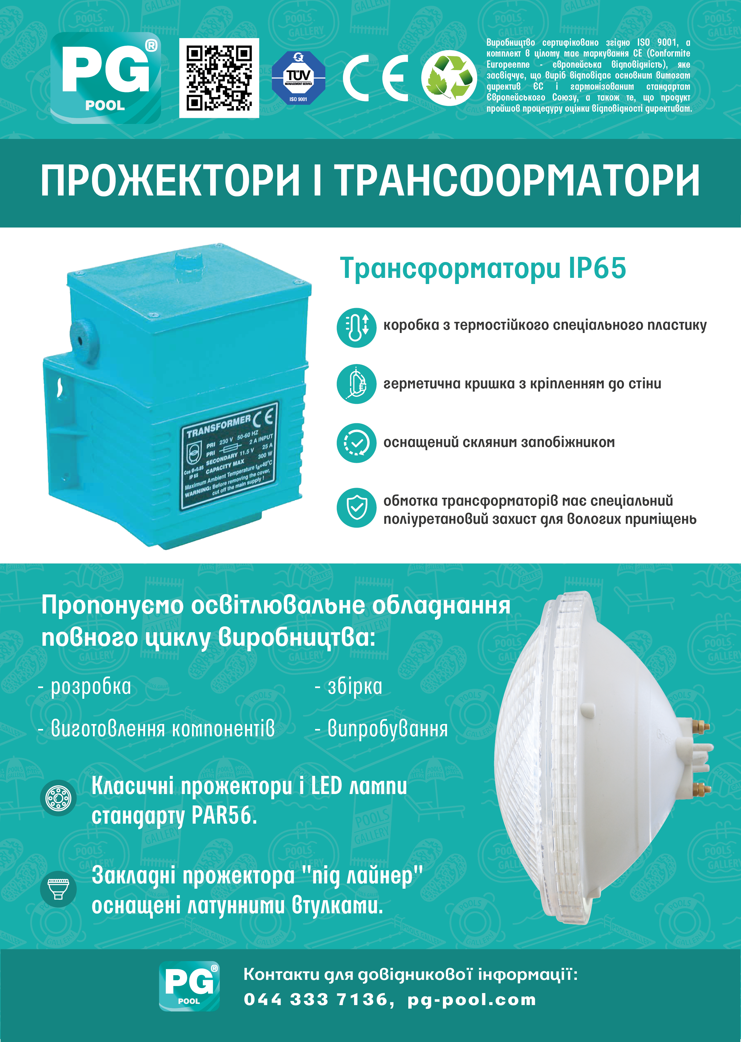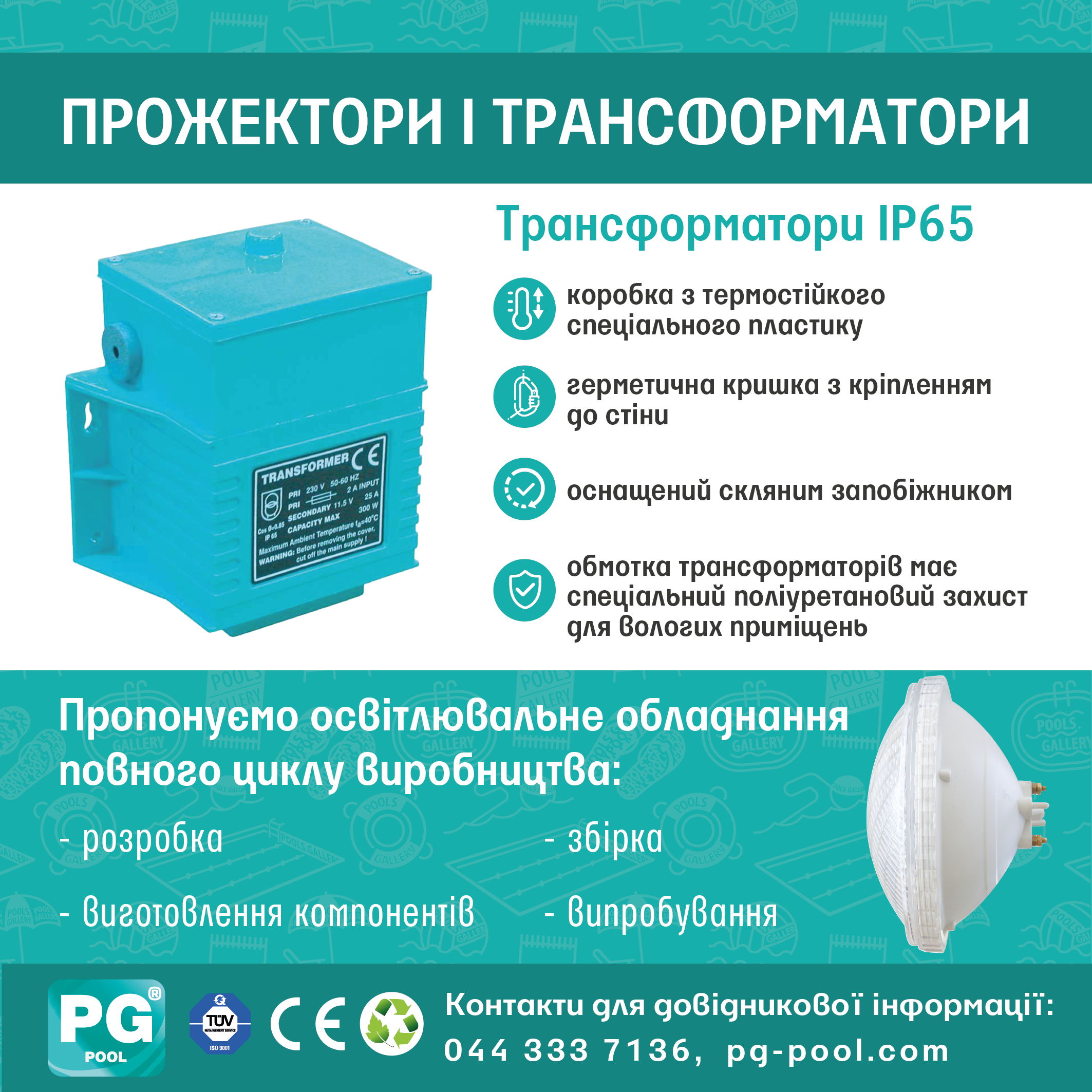 Трансформатор PG арт. PG-PG-05069 потужністю 50 Вт, призначений для перетворення напруги 220 В в 12 В, при установці підводного освітлення в басейнах.