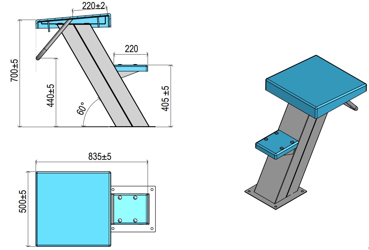 Стартова тумба виготовлена з високоякісної нержавіючої сталі AISI 304. Має протисковзьке покриття для безпеки та сталеву ручку-поручень для легкого виходу з води. Положення платформи та положення ручки можна відрегулювати на 3 см вперед або назад.