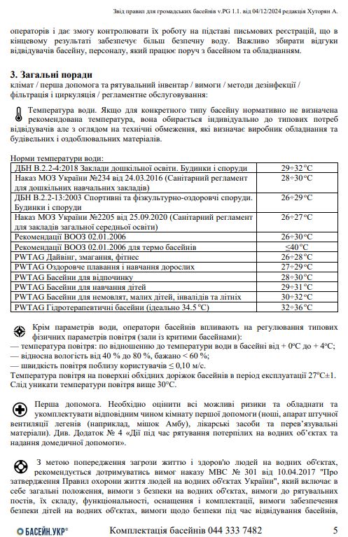 - Рекомендації ВООЗ. Рекомендації щодо безпечного водного середовища для відпочинку. Том 2: Плавальні басейни та подібні середовища» від 02.01.2006р.;