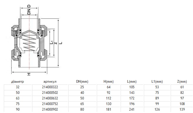 Зворотній клапан 32 мм перешкоджає зворотному поверненню води в трубопровід.